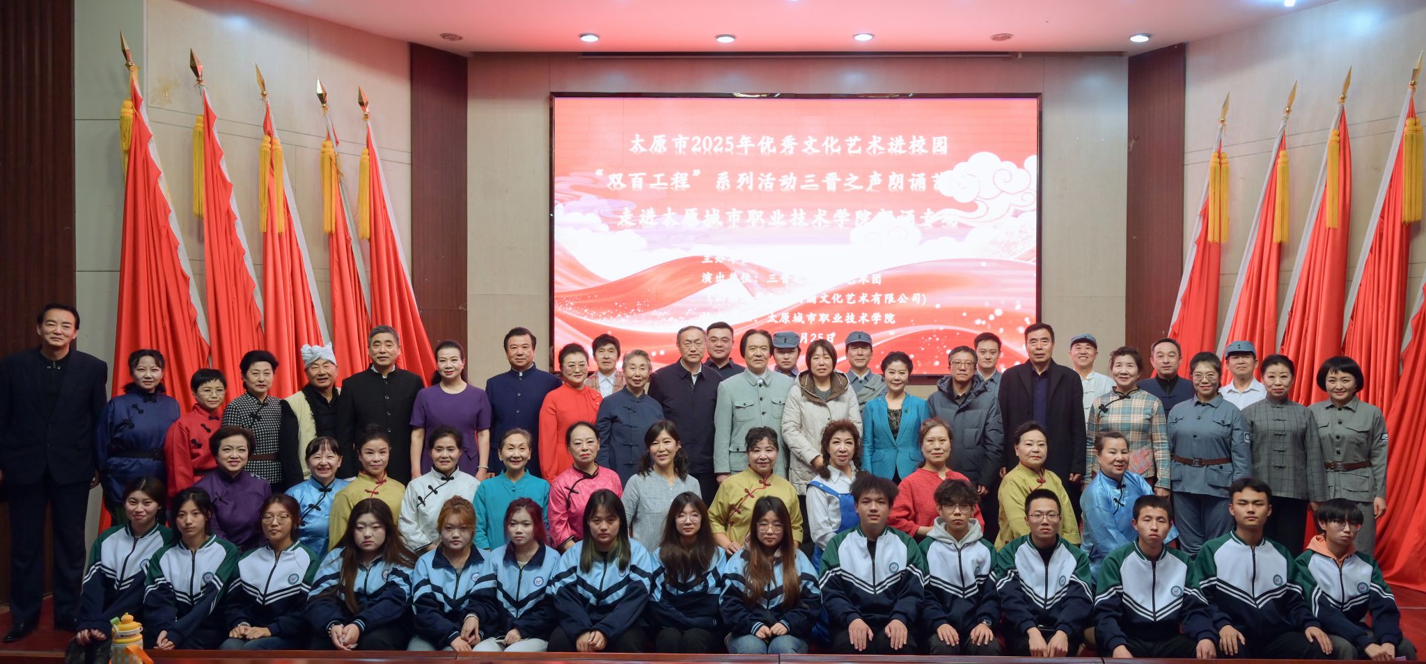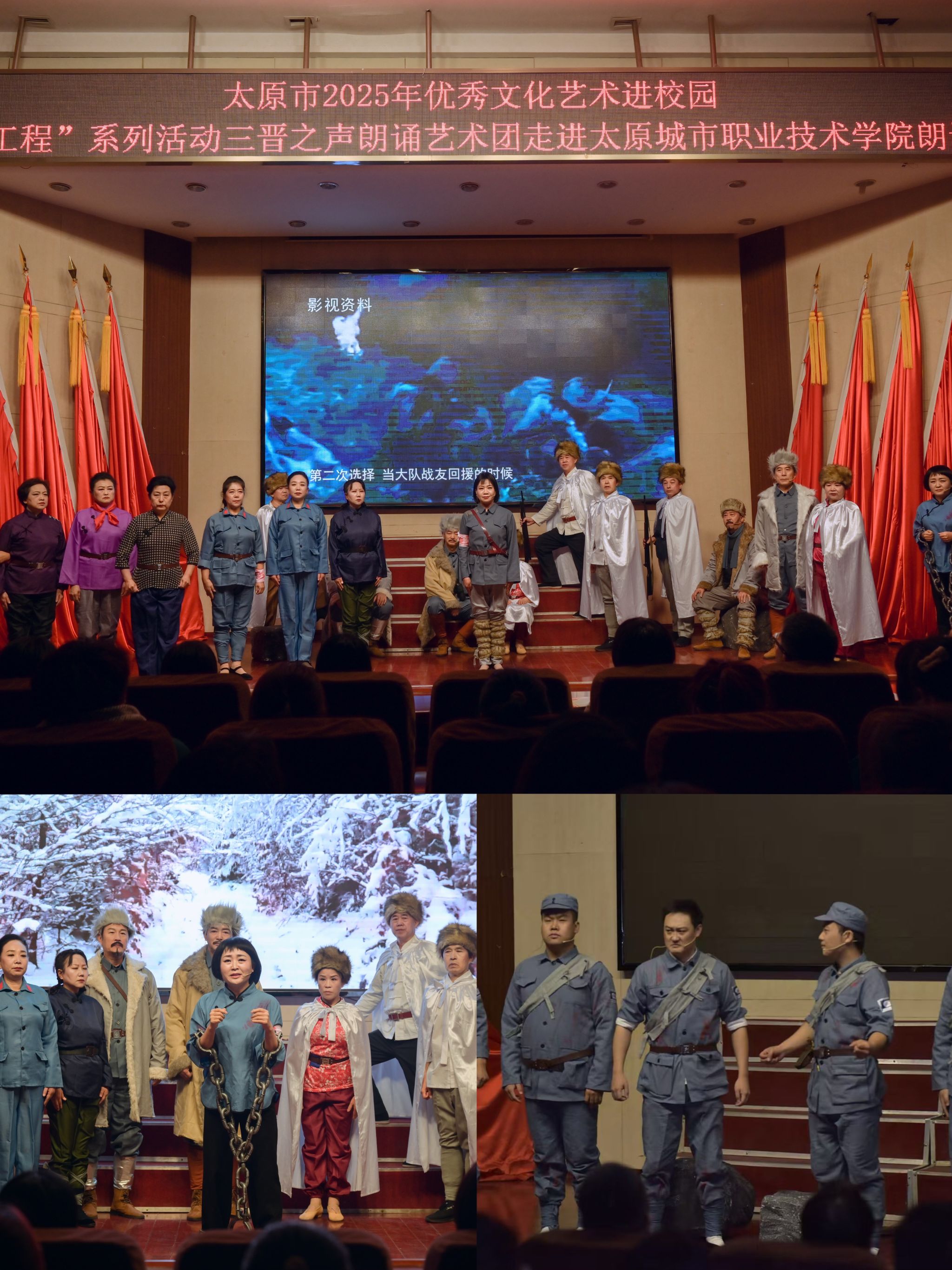 11月25日下午,太原市2025年优秀文化艺术进校园“双百工程”朗诵专场在学院学术交流中心精彩上演。本次活动由太原市教育局主办,太原城市职业技术学院承办,三晋之声朗诵艺术团倾情献艺,为师生带来一场沉浸式红色文化盛宴。