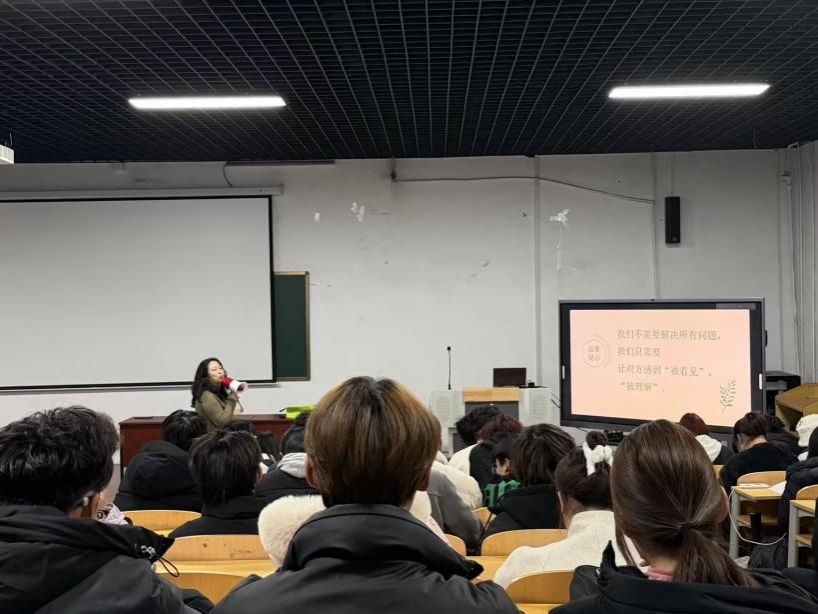 12月8日,首场理论培训在匠心楼四层阶梯教室举行,闫春雨老师主讲。讲座围绕角色定位、技能实操等四大版块,明确心理委员三重身份与工作原则,传授倾听技巧、危机识别及转介路径,为工作开展奠定基础。