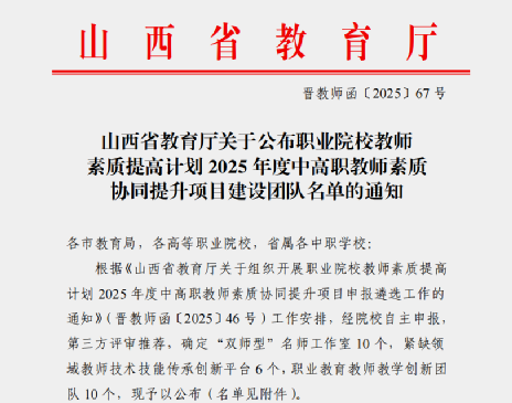 近日,山西省教育厅正式公布了2025年度职业院校教师素质提高计划中高职教师素质协同提升项目建设团队名单。工程经济系智能建造技术专业教师团队凭借扎实的建设基础、鲜明的育人特色与突出的教学成效,成功获批省级“双师型”名师工作室。这标志着学院在深化产教融合、强化“双师型”教师队伍建设方面取得了又一重要里程碑。