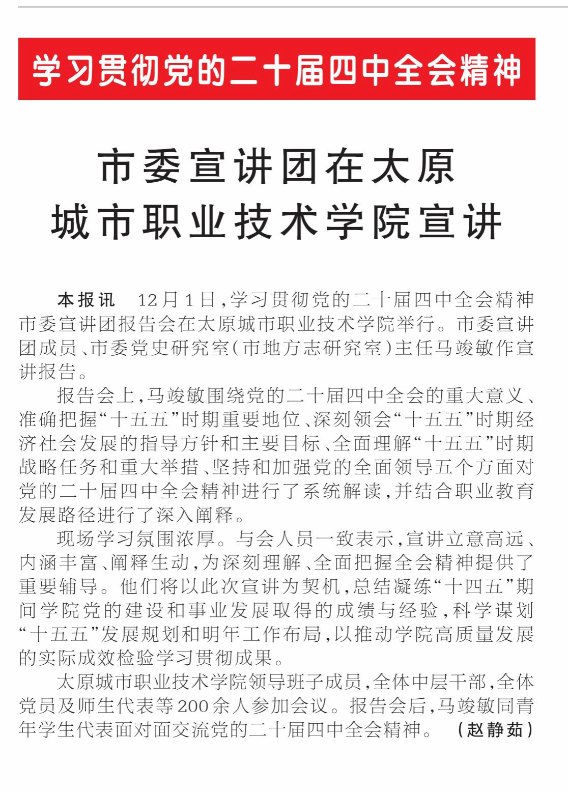 12月1日,学习贯彻党的二十届四中全会精神市委宣讲团报告会在太原城市职业技术学院举行。市委宣讲团成员、市委党史研究室(市地方志研究室)主任马竣敏作宣讲报告。