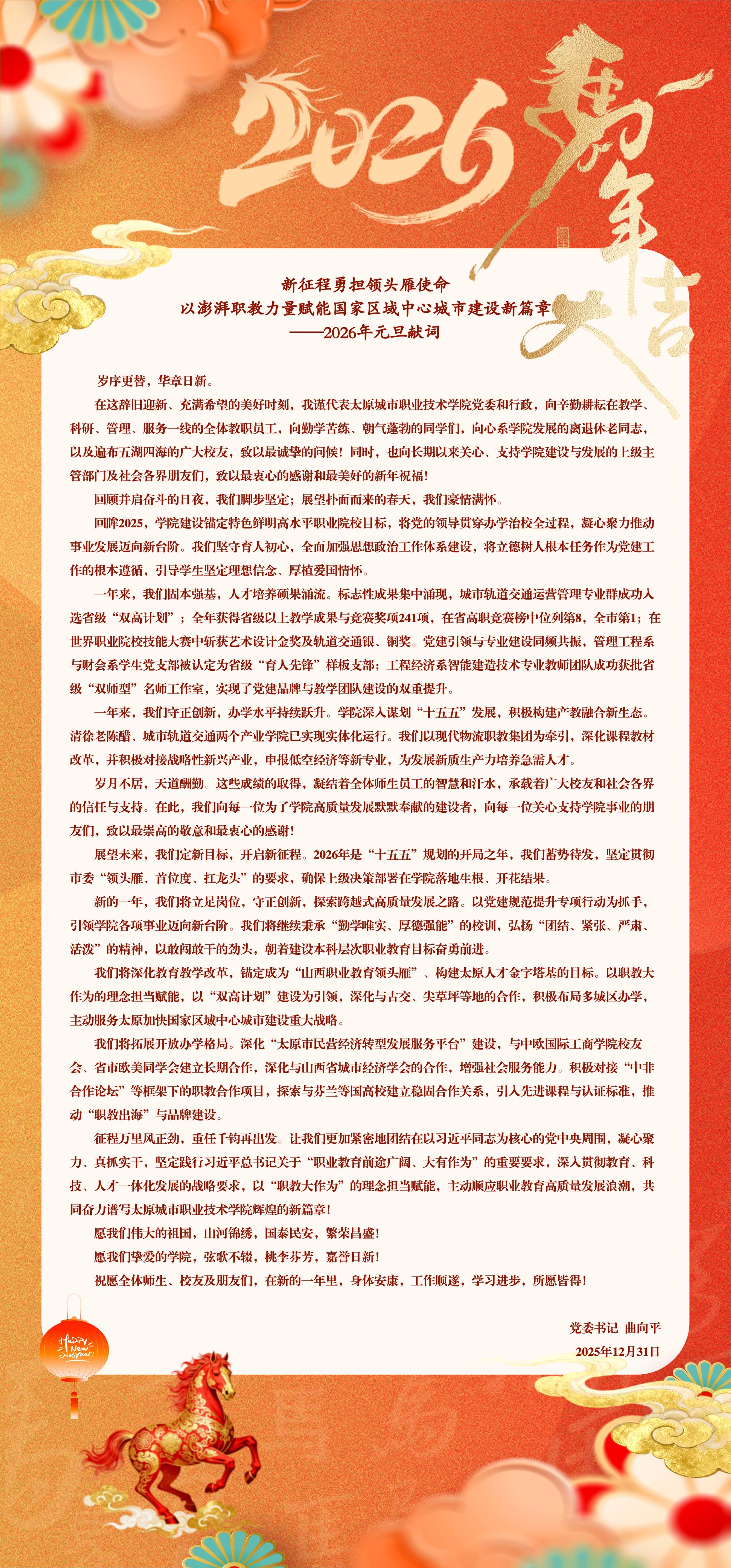 在这辞旧迎新、充满希望的美好时刻,我谨代表太原城市职业技术学院党委和行政,向辛勤耕耘在教学、科研、管理、服务一线的全体教职员工,向勤学苦练、朝气蓬勃的同学们,向心系学院发展的离退休老同志,以及遍布五湖四海的广大校友,致以最诚挚的问候!同时,也向长期以来关心、支持学院建设与发展的上级主管部门及社会各界朋友们,致以最衷心的感谢和最美好的新年祝福!