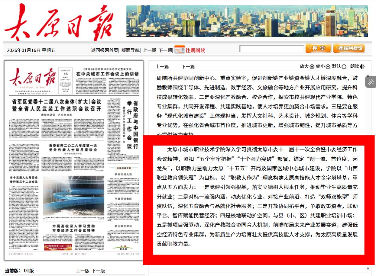 太原市城市职业技术学院深入学习贯彻太原市委十二届十一次全会暨市委经济工作会议精神,紧扣“五个牢牢把握”“十个强力突破”部署,锚定“创一流、首位度、起龙头”,以职教力量助力太原“十五五”开局及国家区域中心城市建设,学院以“山西职业教育领头雁”为目标,以“职教大作为”理念构建太原高技能人才金字塔塔基,重点从五方面发力:一是党建引领强根基,落实立德树人根本任务,推动毕业生高质量充分就业;二是对标一流强内涵,动态优化专业,对接产业前沿,打造“双师双能型”师资队伍,深化五育融合与品牌化社会服务;三是开放协同拓平台,争取政策资金,联动平台、智库赋能民营经济;四是校地联动扩空间,与县(市、区)共建职业培训市场;五是抓项目强驱动,深化产教融合协同育人机制,前瞻布局未来产业发展赛道,建强低空经济特色专业集群,为新质生产力培育壮大提供高技能人才支撑,为太原高质量发展贡献职教力量。