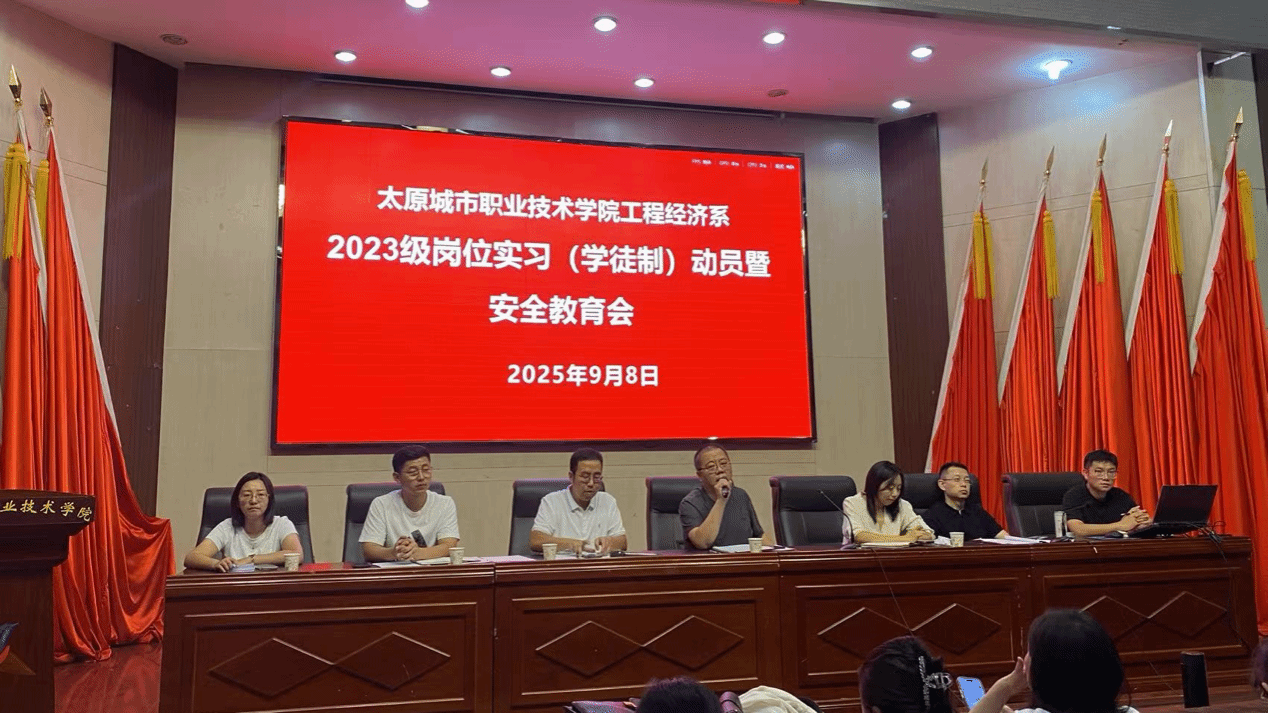 9月8日下午,工程经济系在图书馆四层大报告厅举办“2023级岗位实习(学徒制)动员、安全教育暨2025年企业进校园宣讲会”。会议由工程经济系副主任王博主持,系领导、各教研室负责人、23级各班指导教师及班主任共同参会。