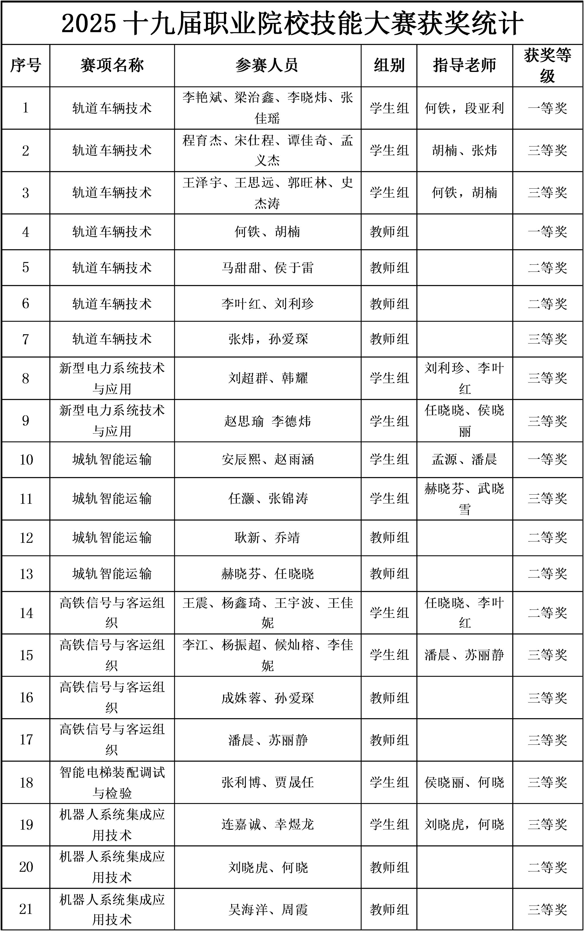 近日,第十九届全国职业院校技能大赛圆满落幕。太原城市职业技术学院机电工程系师生组成的参赛队伍凭借扎实的专业功底、精湛的实操技能,在激烈角逐中脱颖而出,共斩获21项奖项。其中一等奖3项、二等奖6项、三等奖12项,充分展现了系部在技能人才培养方面的丰硕成果与师生们精益求精的工匠精神。具体获奖信息如下: