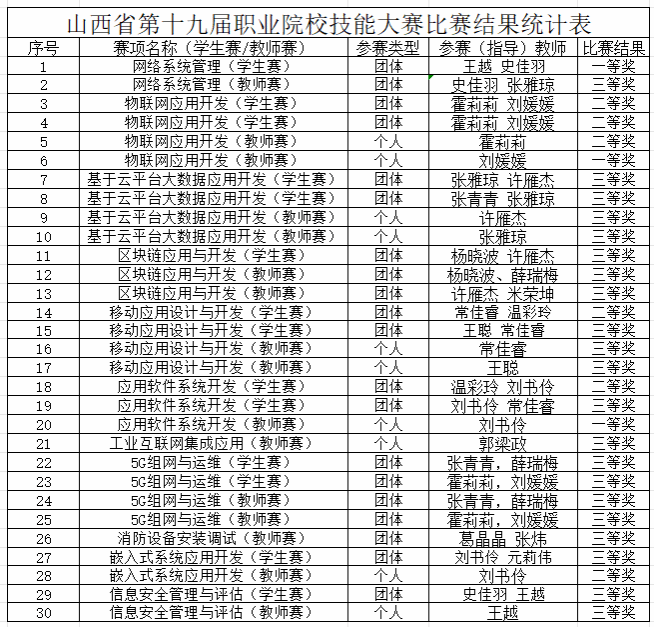 11月30日,信息工程系参加的山西省第十九届职业院校技能大赛赛项全部结束。信息工程系师生不负众望、奋勇争先,凭借扎实的专业功底与精湛的实操技能斩获多项殊荣。本次大赛,该系共参与11个赛项角逐,最终收获学生组一等奖3项、二等奖6项、三等奖21项,充分彰显了系部职业教育教学改革与技能人才培养的扎实成效。