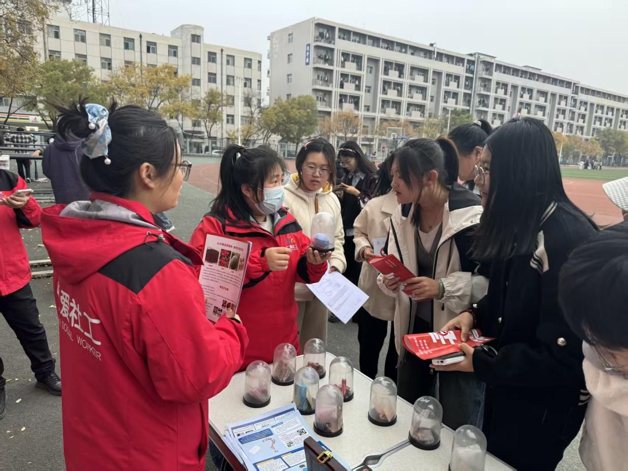 为切实提升学院师生对药物滥用、新型伪装毒品的辨识能力及网络诈骗防范意识,筑牢校园安全防护网, 11月6日学院安全稳定办公室联合太原市公安局尖草坪分局民警和仁爱戒毒社的工作人员在匠韵楼前广场和体育场分别开展“反诈+禁毒”主题宣传教育活动。