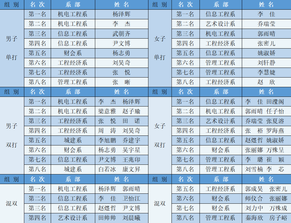 本次比赛坚持“公平、公正、公开”的原则,裁判团队严格执裁,认真履行职责,确保了每一场比赛的顺利进行。经过多轮激烈角逐,各项目分别决出前八名。获奖选手们手持荣誉证书,脖子上佩戴闪亮的奖章,脸上洋溢着自豪的笑容,他们用实力证明了自己,也为校园体育文化增添了亮色。