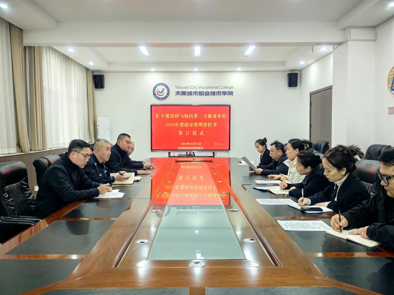 为深入落实学院安全工作部署,全面压实安全主体责任,构建“权责明晰、协同联动”的校园安全管理体系,10月21日下午,安全稳定办公室于匠心楼一层会议室组织开展2026年第三方单位治安管理责任书签订仪式。汇丰派出所民警、安全稳定办公室工作人员及校内餐饮、物业等合作企业代表共计15人参会。活动通过警示教育、责任书签订、条款解读、表态承诺等环节,推动安全责任层层传导、落地生根。