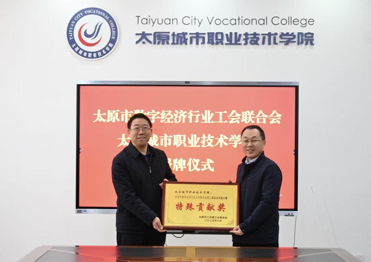1月16日上午,太原市总工会党组成员、副主席汪伦一行来到学院,为学院颁发太原市数字经济行业工会联合会第二届职业技能大赛“特殊贡献奖”,学院党委书记曲向平出席。